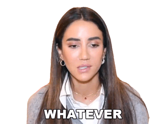 Tamara Kalinic makes a dismissive face, shrugging off a situation with the word 'WHATEVER' displayed, conveying indifference.