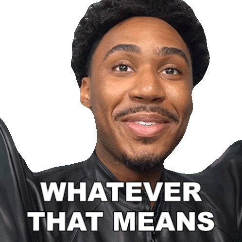 A man in a black jacket smiles and shrugs with the text "Whatever That Means," expressing dismissive agreement or confusion.