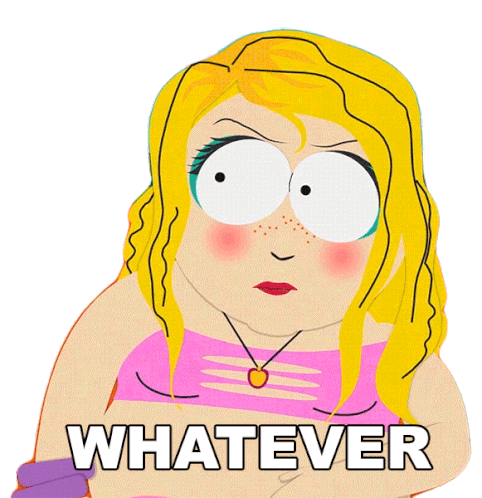South Park character Vanity expresses indifference with a dismissive 'Whatever' caption, perfect for showing you don't care.