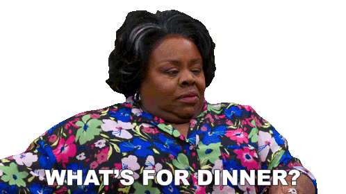 Ella Payne, wearing a vibrant floral shirt, asks the classic question, 'What's for dinner?'