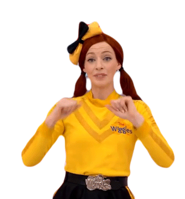 Emma Wiggle, from The Wiggles, looks around with a curious expression, wearing her signature yellow shirt.
