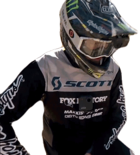 Red Bull rider in a helmet and goggles, looking surprised with a 'Whats That' expression, wearing a Scott jersey.