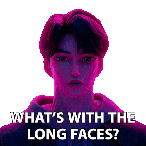 Ginu, an animated character from Kpop Demon Hunters, asks 'What's with the long faces?' with a concerned expression.