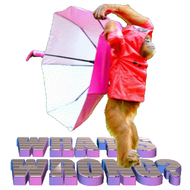 A funny orangutan in a red raincoat holds a pink umbrella over its head, standing on 3D 'What's Wrong' text.