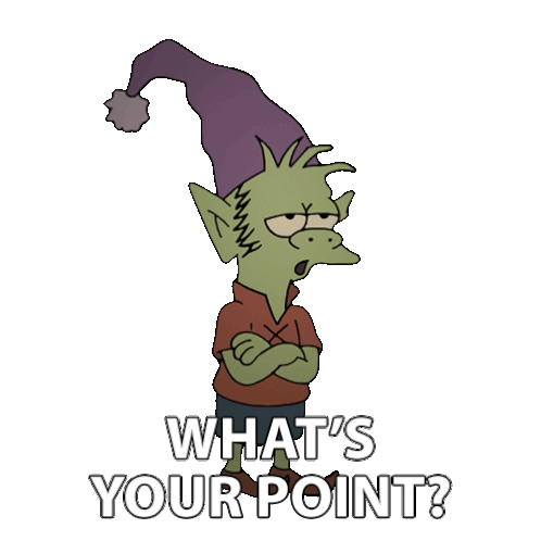 Elfo from Disenchantment, arms crossed, asks "What's your point?" with a confused expression.