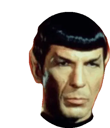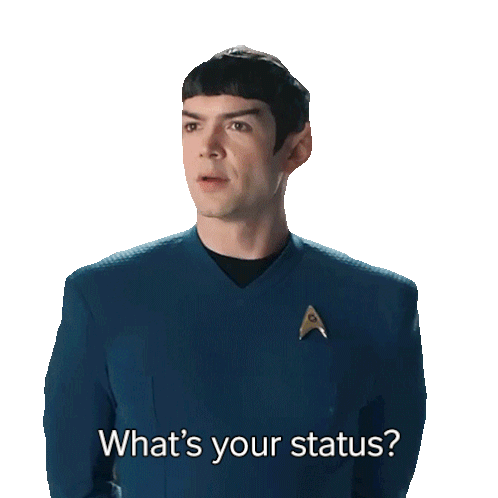 Spock, in his iconic Starfleet uniform, looks intently and asks 'What's your status?' with a serious expression.
