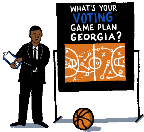 A basketball coach presents a game plan for voting in Georgia, asking 'What's Your Voting Game Plan Georgia?'
