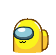 A cute pixel art yellow Among Us character blushes with hearts floating around, looking shy and lovely.