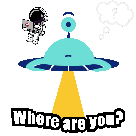 A UFO with an astronaut and a thought bubble asks 'Where are you?' as it searches with its beam.