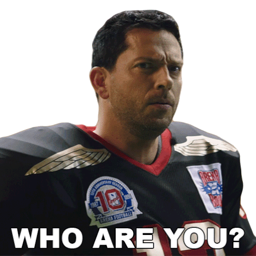 Zachary Levi as Kurt Warner in an Arena Football jersey asks 'Who are you?' with a questioning look.