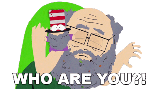 Mr. Garrison, holding a puppet, looks surprised and asks 'WHO ARE YOU?!' in this animated South Park sticker.