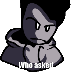 An animated grayscale character in a hoodie with an angry expression, accompanied by the text "Who asked".