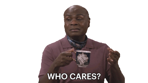 Arthur Broussard, holding a mug, shrugs dismissively and asks, "Who cares?" with an indifferent look.