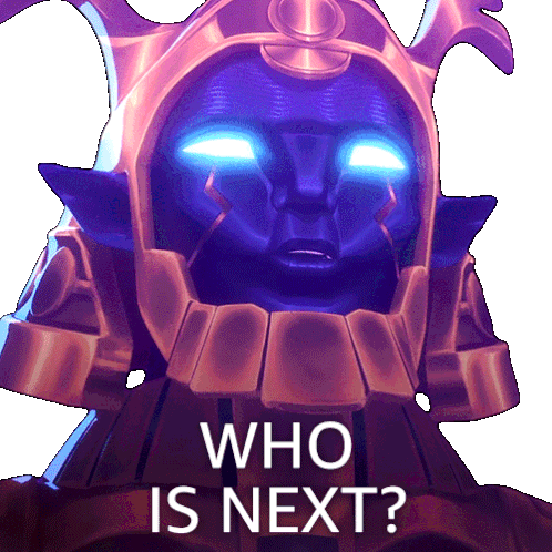 Kamaljori, a purple-skinned character with glowing eyes, asks "WHO IS NEXT?" in this animated sticker from The Legend of Vox Machina.