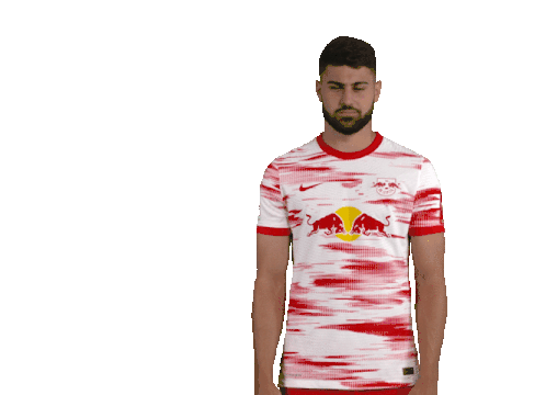 Josko Gvardiol, wearing his RB Leipzig jersey, performs a classic shrug gesture, conveying 'I don't know' or 'whatever'.
