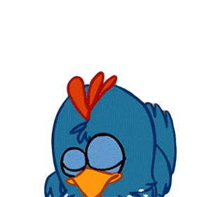Galinha Pintadinha, the blue chicken, reacts with a sudden, wide-eyed expression of shock and surprise, exclaiming 'Whoa Wow!'