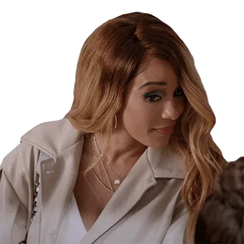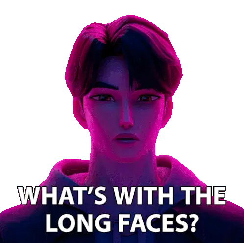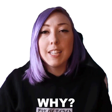 Ashnichrist, a woman with purple hair, asks 'Why?' with a questioning and then smiling expression.