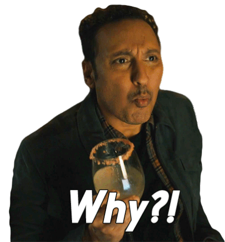 Ben Shakir, played by Aasif Mandvi, holds a glass and exclaims "Why?!" in this sticker from Evil.