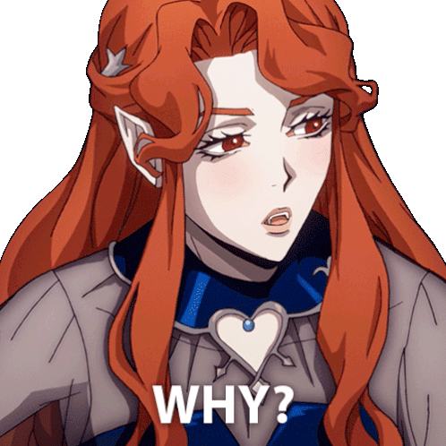 Lenore from Castlevania, voiced by Jessica Brown Findlay, looks confused and asks 'Why?' in this animated sticker.