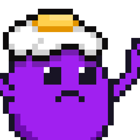 a pixel art drawing of a purple whale with a yellow egg on its head .