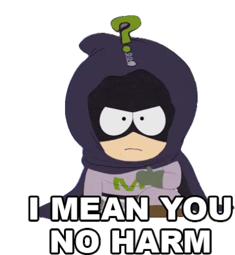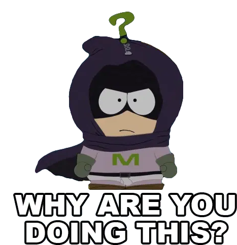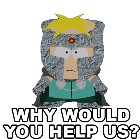 Butters Stotch, as Professor Chaos from South Park, asks "Why Would You Help Us?" with a surprised expression.
