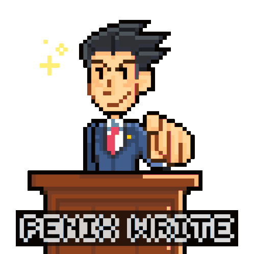 Wibbz's pixel art sticker features Phoenix Wright in his iconic pointing pose behind a bench, with 'FENIX WRITE' text below.