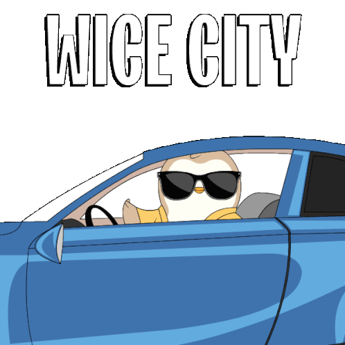 A cool penguin wearing sunglasses drives a blue car with 'WICE CITY' text, embodying a retro Vice City vibe.