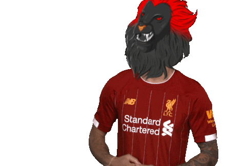 A person wearing a fierce black and red lion mask and a Liverpool FC jersey flexes their biceps, showing strength.
