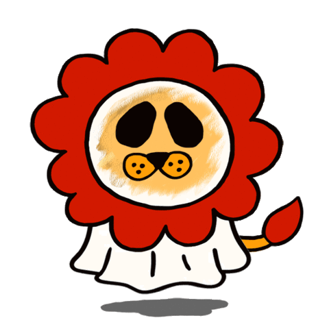 An animated sticker of a cute, sad lion character with a red flower-like mane and a white ghost-like body, floating gently.
