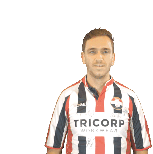 Willemii, a Willem II football player, smiles and salutes while a yellow card appears, showing sportsmanship.