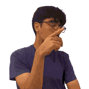 a man wearing glasses and a blue shirt holds his finger to his nose