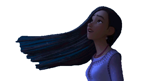 Asha from Disney's Wish, with her long dark hair gracefully flowing in the wind, looking up with a gentle smile.