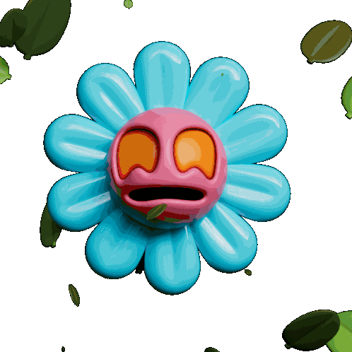 a blue flower with a pink face and orange eyes surrounded by green leaves