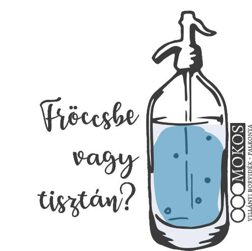 Animated sticker featuring a seltzer bottle and the Hungarian question 'Fröccsbe vagy tisztán?' about wine.