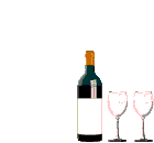 A bottle of red wine is uncorked, then pours its rich contents into two empty wine glasses.