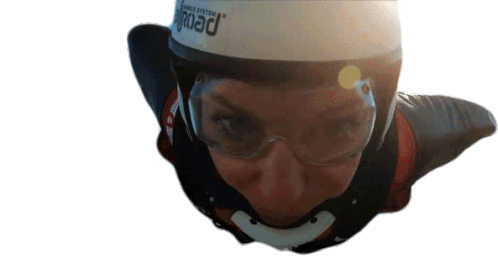A Red Bull Wingsuit Flying skydiver in freefall, wearing a helmet and goggles, looking focused and enjoying the experience.
