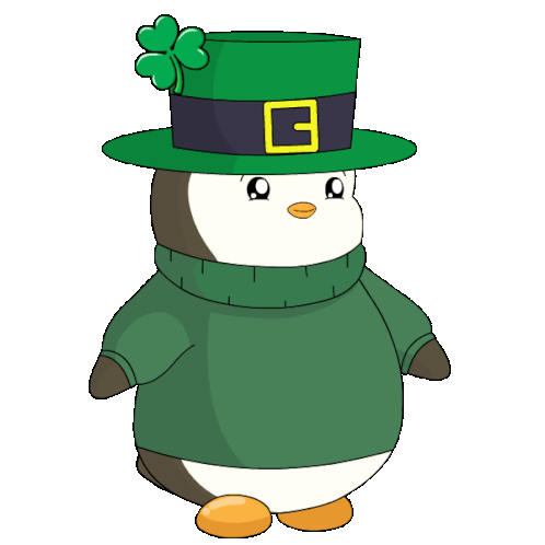 A cute, winking pudgy penguin in a green sweater, balancing a beer mug and holding a clover flag for St. Patrick's Day.