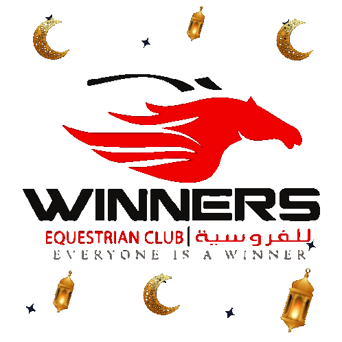 Dynamic red horse logo for Winners Equestrian Club, adorned with festive crescent moons and lanterns, celebrating success.