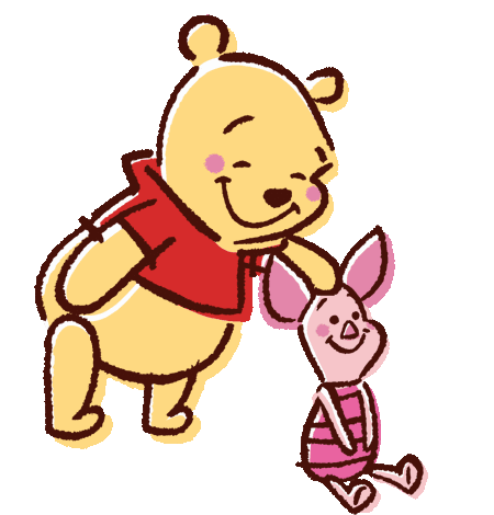 Winnie The Pooh gently pats Piglet's head, showing sweet affection with hearts floating around Piglet.