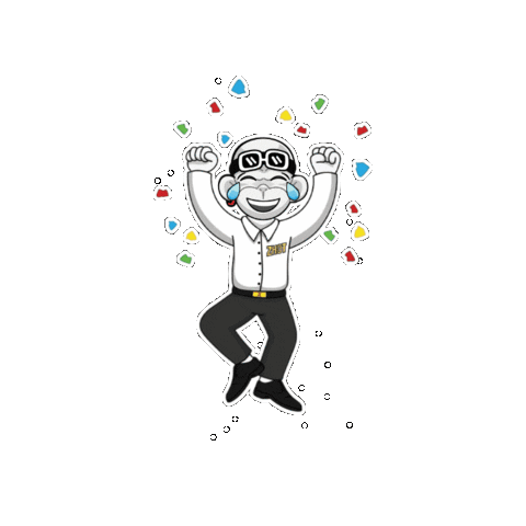 A joyful cartoon character, wearing goggles and a mask, jumps excitedly amidst colorful confetti, celebrating a victory.