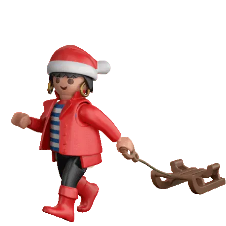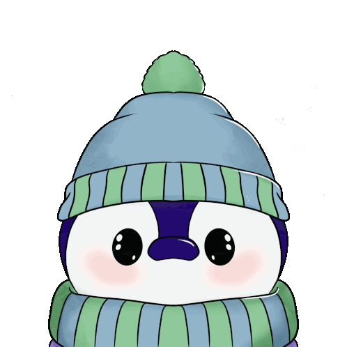 Adorable animated penguin wearing a blue and green winter hat and scarf, with snow falling gently.
