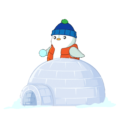 A cute cartoon penguin in a blue hat and orange vest stands behind an igloo, holding a snowball ready to throw.