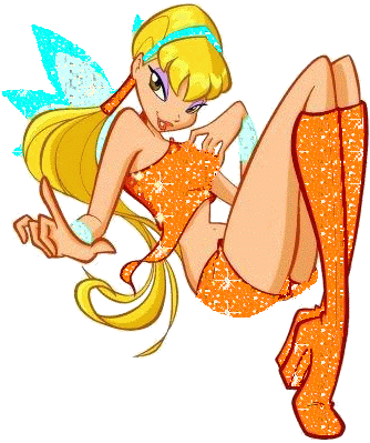 Stella from Winx Club sparkles while lying down with a blue headband, showcasing her magical essence.