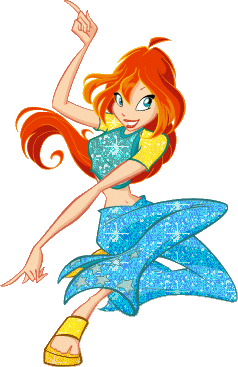 Winx Club Bloom, the fairy of the Dragon Flame, points with a determined expression in her iconic blue and yellow outfit.