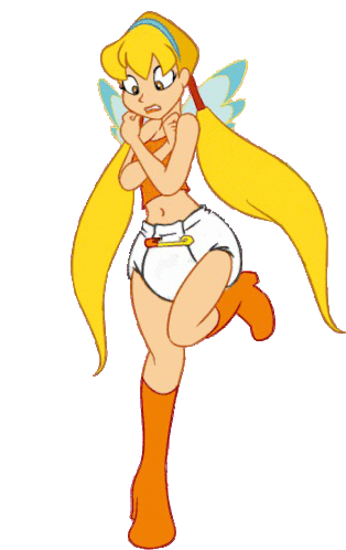 Stella from Winx Club appears scared or nervous, wearing a diaper and her fairy wings, with hands clasped.