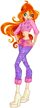 Winx Club Bloom, the cartoon girl, appears in a sticker wearing a pink sweater and purple pants.
