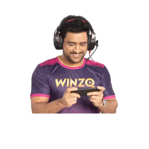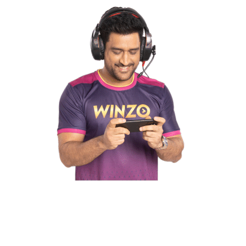 MS Dhoni, wearing headphones and a Winzo t-shirt, smiles while playing a game on his phone, saying 'Khel Raha Hun'.