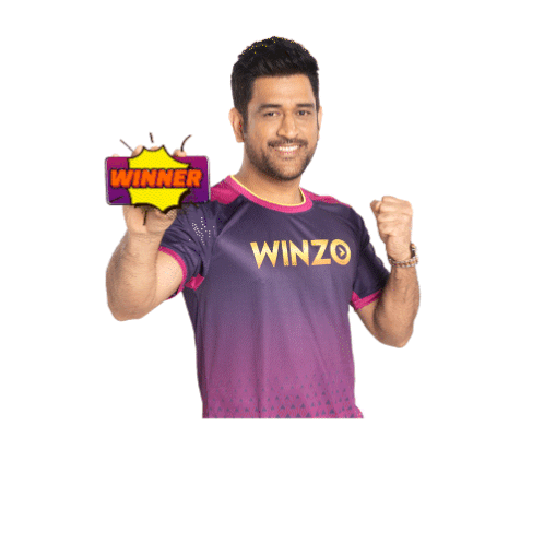 MS Dhoni celebrates a victory, holding a 'Winner' sign and exclaiming 'Main Jeet Gaya' (I Won) with a triumphant pose.