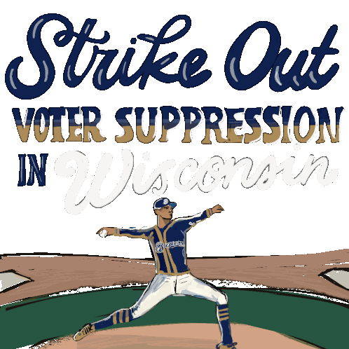 Animated sticker urging to 'Strike Out Voter Suppression In Wisconsin' with a baseball pitcher.