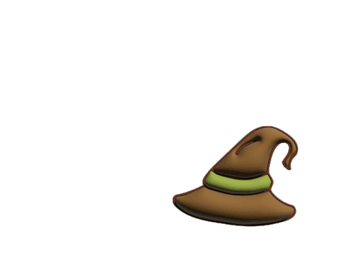 Cashmereundsatin's animated sticker features a brown witch hat with a green band, flying across the screen.